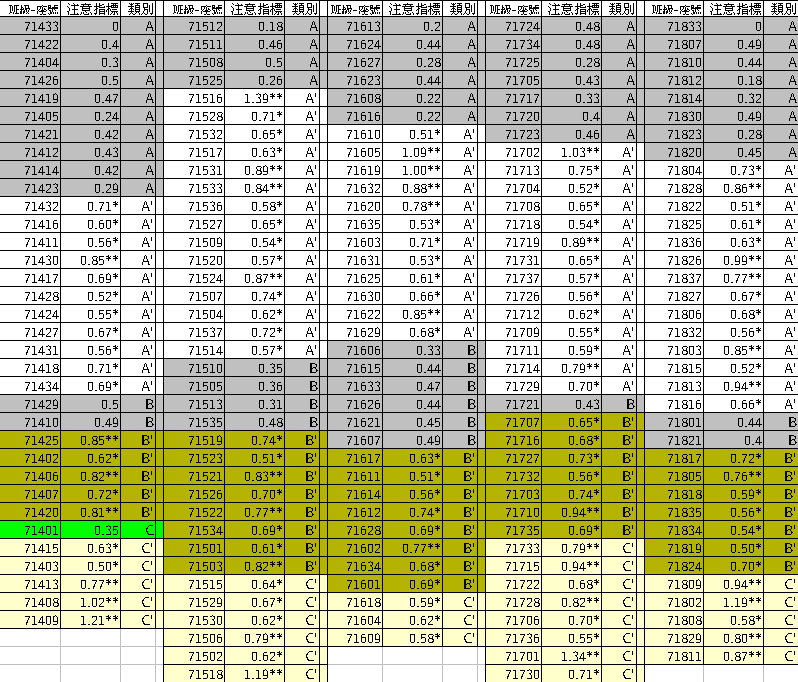 - 學生的答案裡還會有一些其他的答案像是K、M、J這些奇怪的答案,那是因為學生答案卡沒畫好所造成。要把那些替換變成0或是N,才能做分析。替換從E到Z的答案只要用RegExp正規表示法就可以了,方法就是用[E-Z]代替E到Z的各個字母就好了。